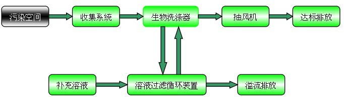 管道收集裝置將惡臭氣體送入Green-XD生物洗滌器,洗滌液由霧化噴灑裝置噴灑到生物填料表面,氣流與洗滌液在穿過生物填料層的過程中完成生物的氣液擴散、液固擴散、生物氧化三個過程,生物填料表面生物膜中的微生物以惡臭氣體物質為營養,惡臭物及VOC被微生物氧化分解,在轉化過程中產生能量,微微生物的生長與繁殖提供能源,使惡臭氣體物質的轉化持續進行,經凈化后的氣體由抽風機引出排放。