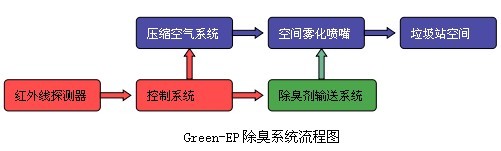 當(dāng)垃圾運(yùn)輸車進(jìn)入垃圾壓縮站設(shè)定的控制區(qū)域,在垃圾站內(nèi)最佳位置設(shè)定的紅外測試器發(fā)出信號(hào),Green-Y智能型除臭設(shè)備按照預(yù)先設(shè)定程序運(yùn)行。